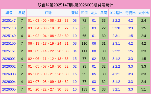 双色球2026005开奖号码为:01、20、22、27、30、33 + 10。
